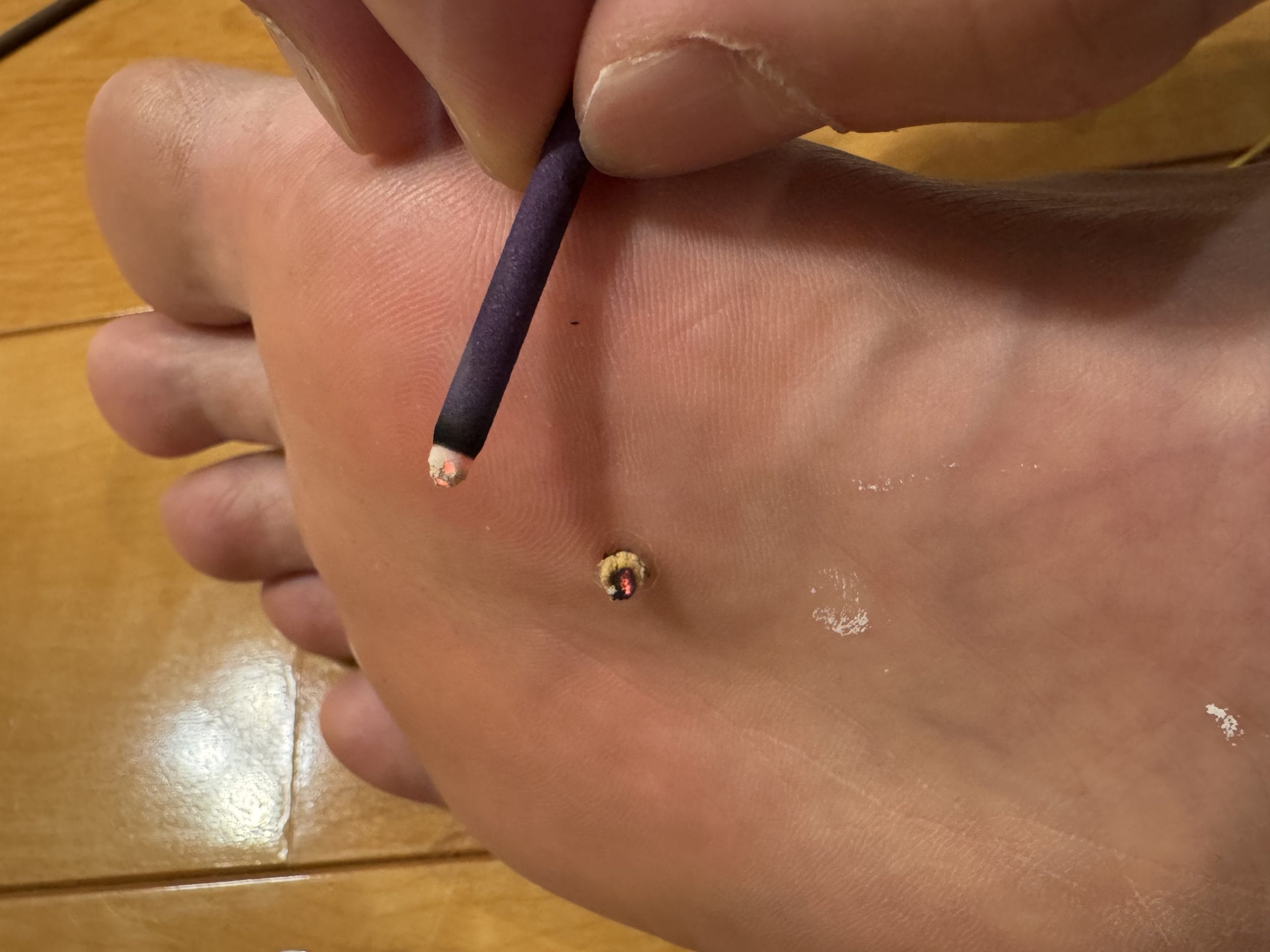 症例紹介 1回目 イボ焼いてみた お灸施術 2026年1/13 (自分の足の裏) 2026.01.14 施灸中 施灸後 子供から水イボうつってしまい、しばらく皮膚科の薬塗っていたが、改善がなかったので 自分でお灸してイボ焼いてみた。 5~6回くらいで取れるかな。 汚い足の裏を晒してゴメンなさい。 施灸日:2026年1/13 施灸法:透熱灸(半米粒大,10壮程度) 用意するもの:もぐさ、線香、アルコール、少しの勇気 備考:イボ(タンパク質)を物理的に灸で焼いて、「炭化」させてポロリが目的。 Post Share Hatena LINE note 症例紹介 刺絡施術 2026年1/13 (主訴: 嗄声させい※声が出にくい症状のこと) 前の記事 2回目 イボ焼いてみた お灸施術 2026年1/14 (自分の足の裏) 次の記事