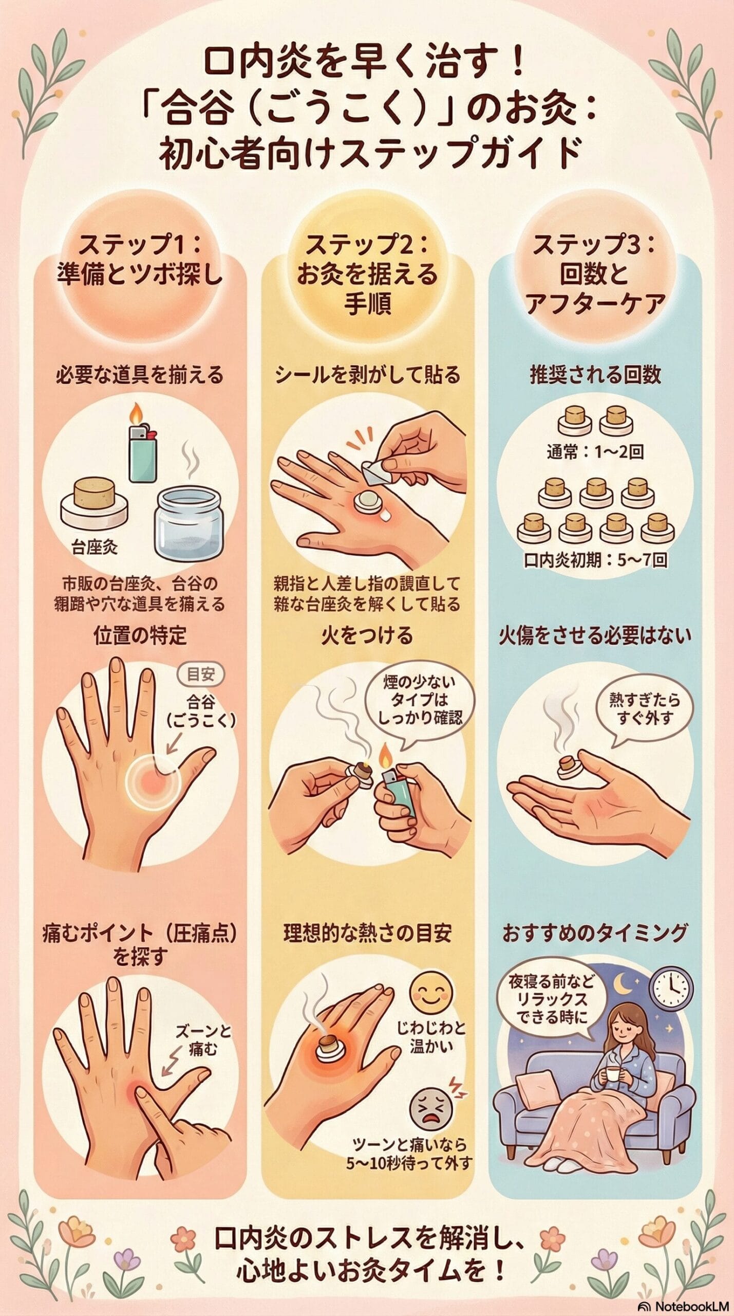 特にお灸は、「あ、口内炎ができそうだな」という初期段階で行うのが最も効果的ですが、悪化してしまった後でも、治りを早くする手助けをしてくれます
